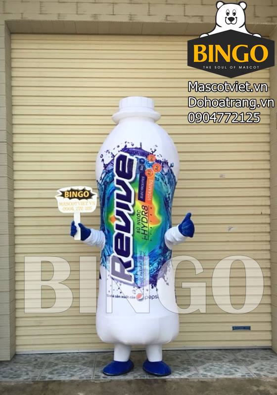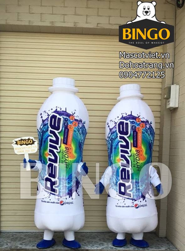 Ngoài những mẩu mascot hóa trang hay mascot trưng bày ra thì mascot mô hình sản phẩm cũng được khá nhiều doanh nghiệp lựa chọn để PR cho doanh nghiệp của họ. Revive là thương hiệu nước giải khát không còn xa lạ gì với khách hàng Việt. Vì thế, để đẩy nhanh tiến độ sản phẩm, Bingo hợp tác cùng thương hiệu này cho ra đời mẫu Mascot Chai Revive cực kì độc đáo và mới lạ.