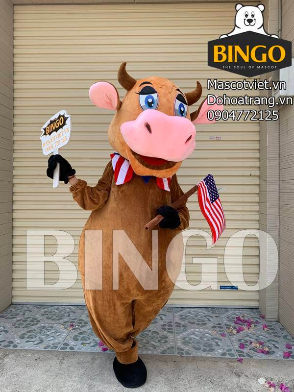 Mascot con bò Mỹ được thiết kế từ vải Velbo có chất liệu mềm mại, sở hữu gam sắc nâu hạt dẻ cùng sự xuất hiện cách điệu của quốc Kỳ Mỹ giúp sản phẩm này nhanh chóng gây ấn tượng mạng trong mắt người nhìn. Dòng Mascot này đặc biệt thích hợp sử dụng tại các trung tâm Anh ngữ cũng như nhiều chương trình thú vị khác.