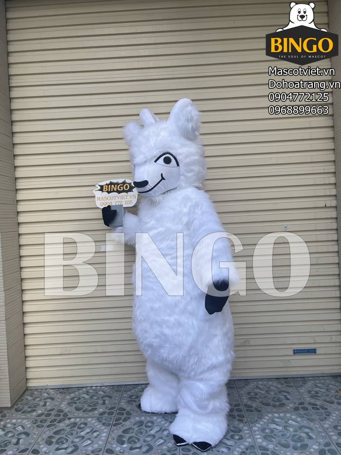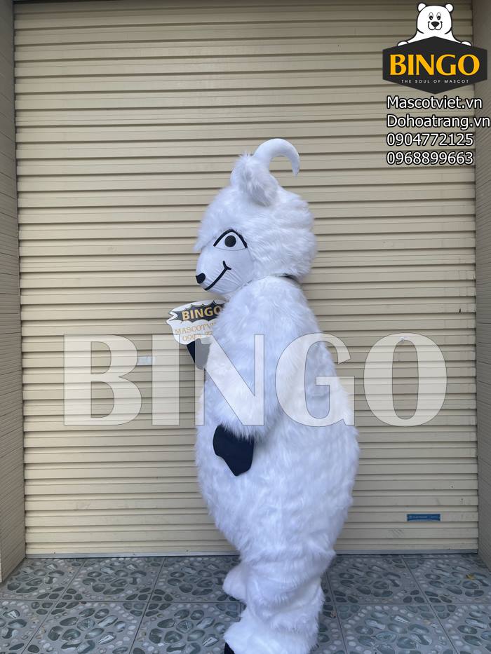 Mascot con dê làm bằng polyester 100%. Bộ áo liền lông màu trắngvới găng tay đi kèm. Mũ trùm đầu bao gồm một bộ râu đính kèm và một cặp sừng trắng, hoàn hảo để xuất hiện, xây dựng hình ảnh thương hiệu.