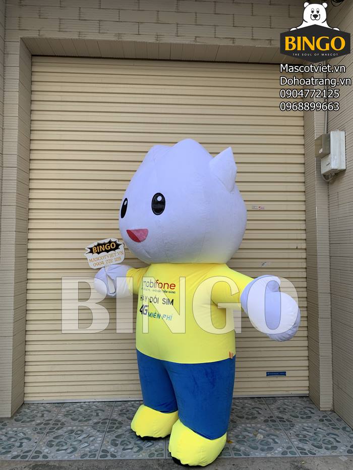 - Mascot hơi Mobifone được thiết kế với phần thân dính liền với phần đầu. Em Mascot hơi Mobifone được mặc một cái áo màu vàng. Bên trên có dòng chữ MobiFone và những dịch vụ của thương hiệu. Dòng chữ được in chắc chắn, sờ mát tay.