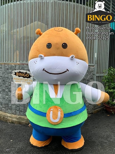Với gương mặt chú hà mã ngộ nghĩnh và bộ quần áo khá độc đáo nên mascot thoạt nhìn rất ấn tượng. Toàn bộ sản phẩm là sự kết hợp của các màu sắc cam, trắng, xanh lá và xanh dương, mọi chi tiết đều được sắp đặt hài hòa, cân đối. Trên mặt mascot còn luôn nở một nụ cười nhẹ nhàng, thân thiện và 2 lỗ mũi cách điệu cực kỳ đáng yêu. Người mặc mascot có thể thoải mái vận động, không lo té ngã bởi vì sản phẩm có may phần lót chân rất cẩn thận.