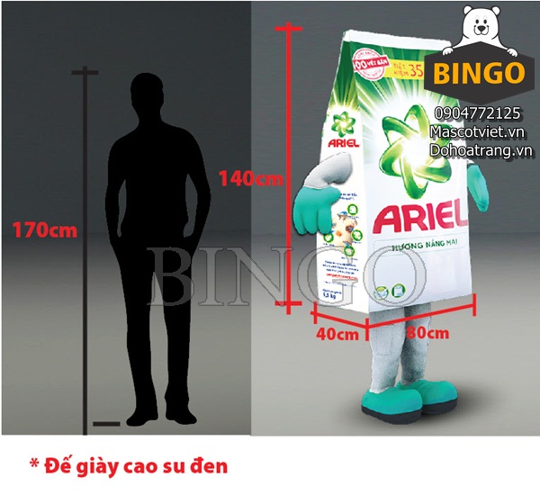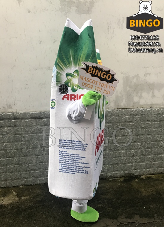 Với thiết kế chuẩn từ hình ảnh demo, từ kích thước, màu sắc đến các chi tiết nhỏ nhất của nước giặt cũng đều được thể hiện rõ nét trên mascot mô hình bịch Ariel. Bạn có thể kham thảo thêm các hình ảnh từ nhiều góc độ của sản phẩm để dễ dàng hình dung ra được. Vậy còn chần chờ gì mà bạn không nhấc máy và liên hệ ngay với chúng tôi để chọn lựa cho mình những trang phục hóa trang tốt nhất!