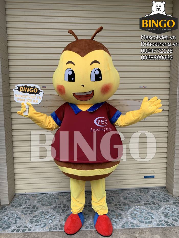 Mascot ong khoác lên mình một chiếc áo nâu đỏ nổi bật, cổ viền xanh cùng dòng chữ gắn liền với thương hiệu của trường màu trắng PEC Learning to be được đặt ở vị trí trước ngực – trang trọng và đấy thuyết phục.