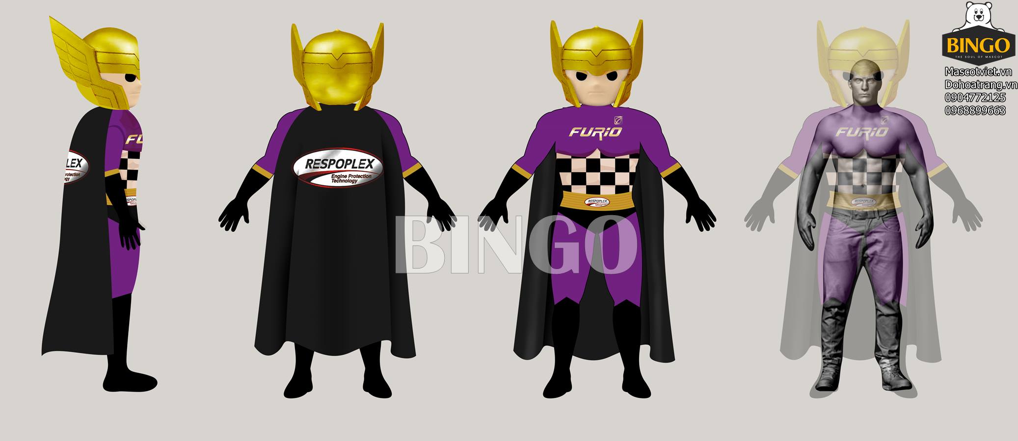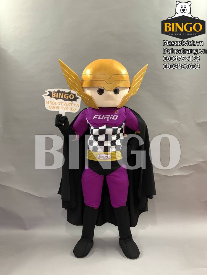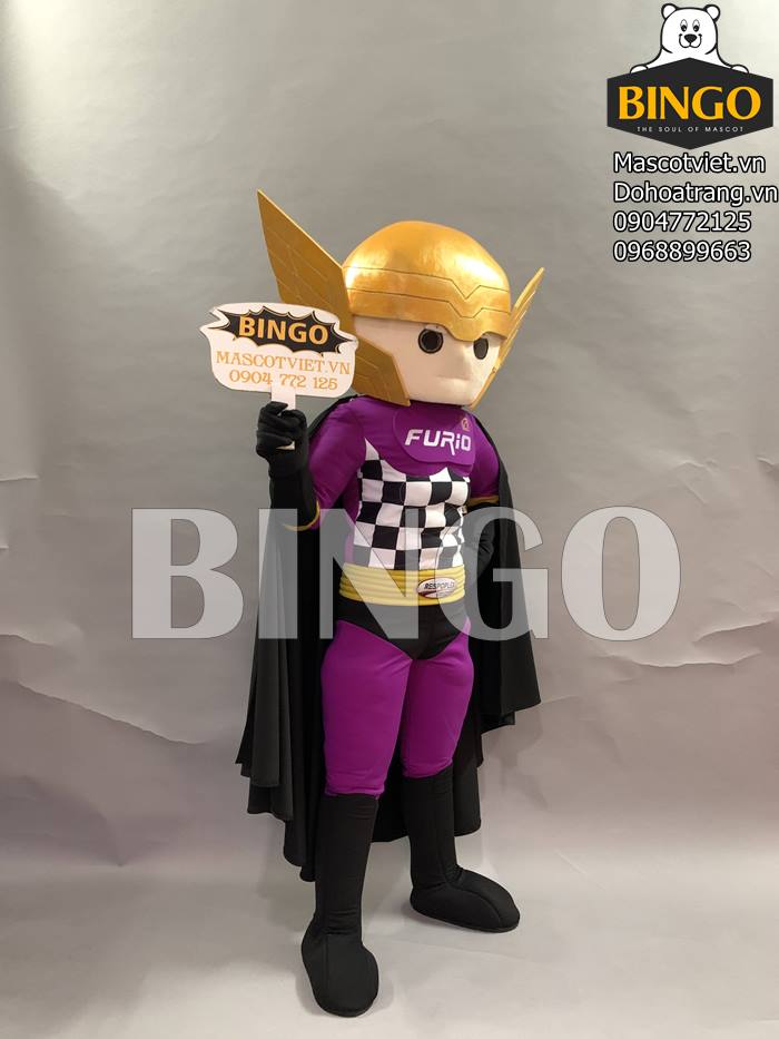 Phần thân mascot là bộ trang phục màu tím và áo choàng đen, thiết kế tạo sự nổi bật cho cái tên thương hiệu Furio màu trắng, phần bụng là kẻ caro đen trắng đan xen với phần đai thắt màu vàng đầy ấn tượng.