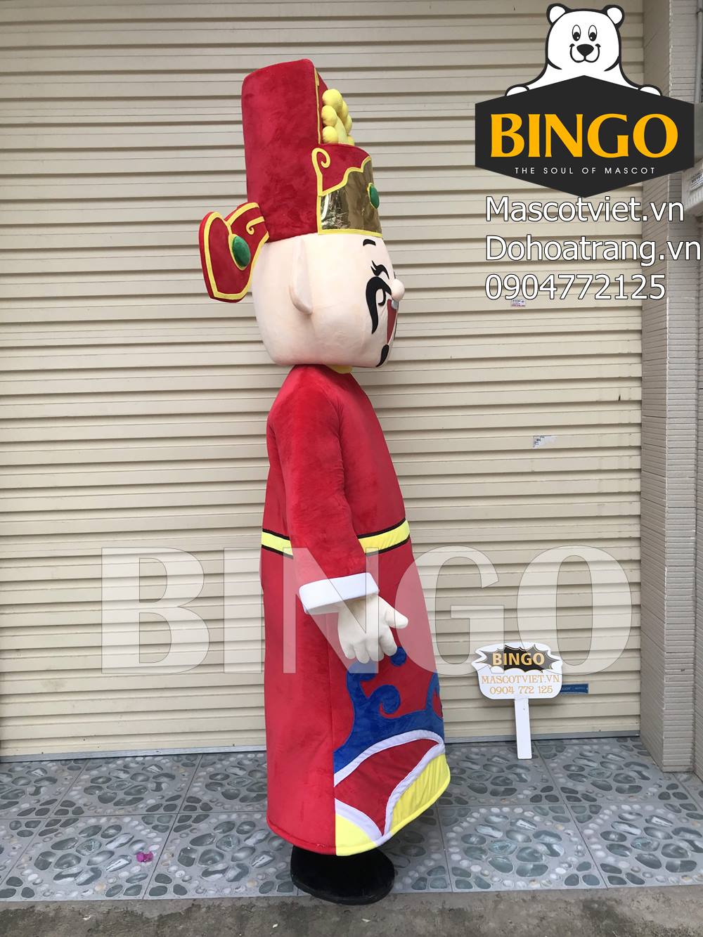 Mascot thần tài sở hữu kích thước và chiều cao tương đương người thật. Sản phẩm có chất liệu làm bằng vải mút xốp ở phần đầu với tạo hình cầu kỳ mô phỏng Thần tài trong truyền thuyết.
