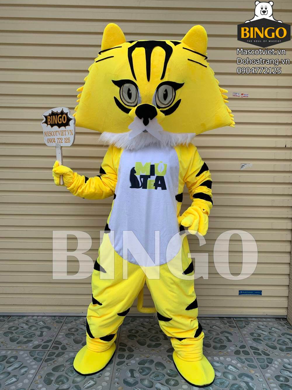 Mascot trà sữa Miu Tea mô phỏng hình ảnh chú mèo với bộ lông vàng kết hợp cách điệu sắc đen khá lạ mắt. Sản phẩm được làm từ vải bông mềm, phần đế giày có lót lớp dép dễ đi lại, tránh hiện tượng trơn trượt.