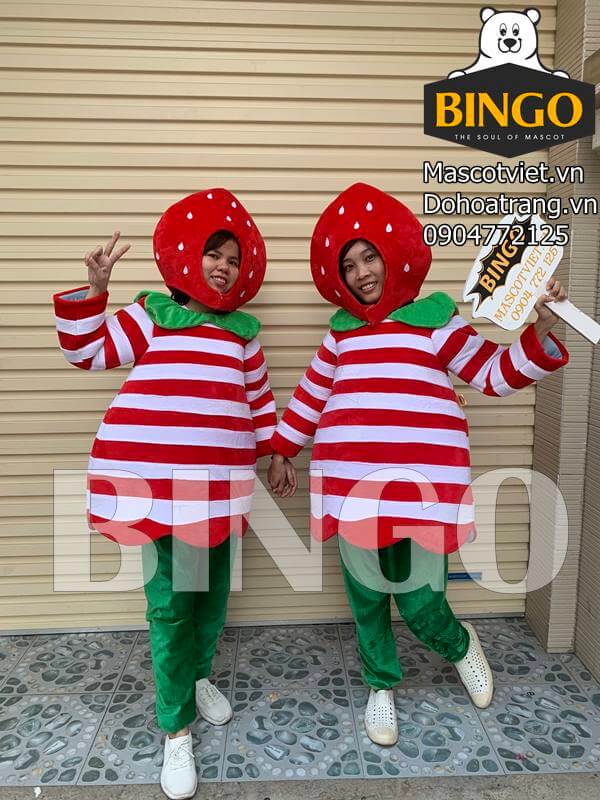 Trang phục hóa trang trái dâu tây được làm từ vải mút, xốp kết hợp bông mềm và nhiều phụ kiện khác. Sản phẩm có phần đầu được may rời, mô phỏng trái dâu chín mọng rất chân thực, sống đống.